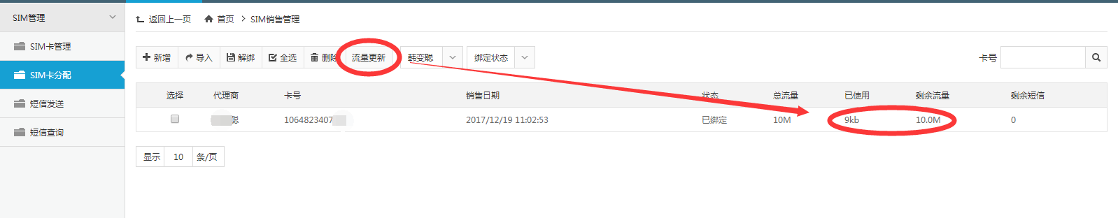 SIM卡分配可查看卡流量使用情况,输入卡号点击流量更新查询当月流量使用情况